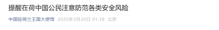 九派新闻查询发现,今年3月,中国驻荷兰王国大使馆官方账号曾发文“提醒在荷中国公民注意防范各类安全风险”。
